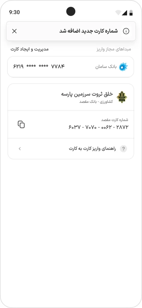 حالا کارت شما در لیست «مبداءهای مجاز واریز» قرار گرفته است. در پایین همین صفحه، سیستم یک «شماره کارت مقصد» (متعلق به شرکت خلق ثروت سرزمین پارسه) به شما نمایش میدهد.