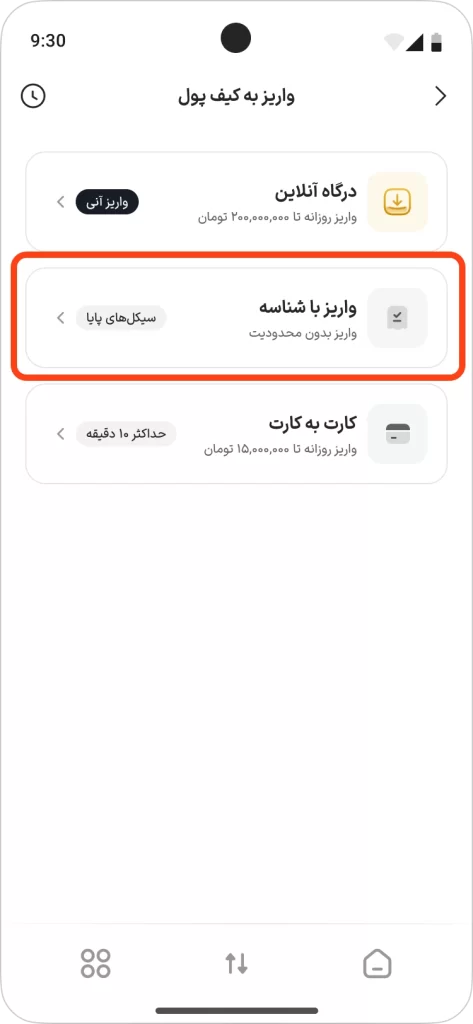 در این صفحه، گزینه «واریز با شناسه» را انتخاب کنید. همانطور که در تصویر میبینید، این روش برای واریزهای «بدون محدودیت» است و زمان نشستن پول به حساب شما، بستگی به سیکلهای پایا (یا ساتنا) دارد.