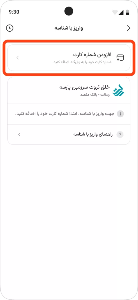 در صفحهای که باز میشود، با پیام «جهت واریز با شناسه، ابتدا شماره کارت خود را اضافه کنید» مواجه میشوید. برای شروع، روی دکمه «افزودن شماره کارت» در کادر بالایی کلیک کنید.