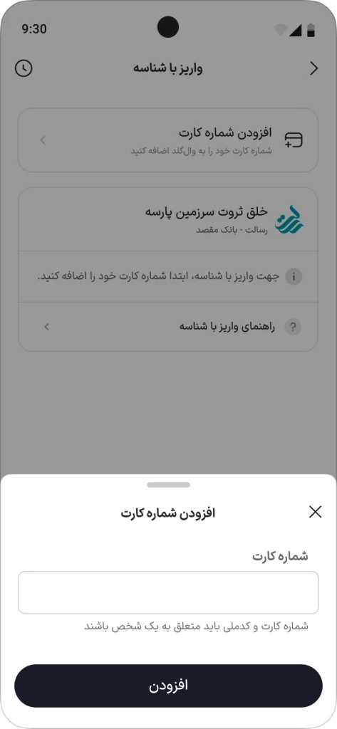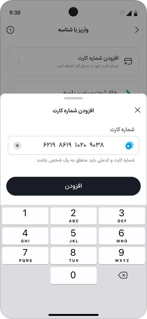 پس از اطمینان از صحت شماره کارت، روی دکمه مشکیرنگ «افزودن» ضربه بزنید.